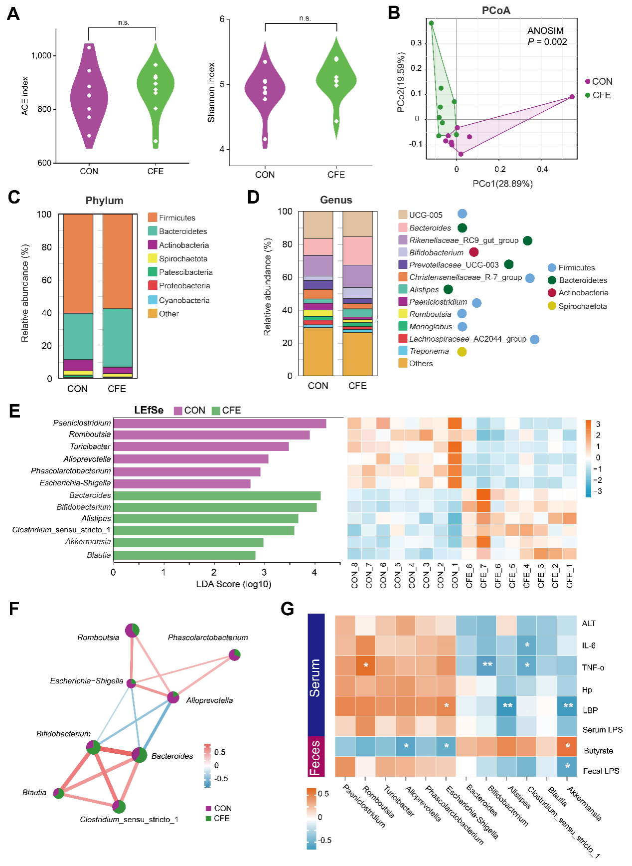 柑橘是全世界产量最高的水果之一,其加工副产物是植物黄酮的丰富来源。本研究选用柑橘黄酮提取物(CFE)直接饲喂泌乳奶牛,发现CFE显著降低了高精料奶牛的血清脂多糖(LPS)、 促炎细胞因子(TNF-α和IL-6)、急性期蛋白(脂多糖结合蛋白和触珠蛋白)浓度。提高了粪便丁酸盐的比例,并减少了粪便LPS含量。研究发现,饲喂CFE提高了粪便中有益细菌,包括拟杆菌、双歧杆菌等相对丰度(图1)。粪便和血清非靶向代谢组学表明,饲喂CFE导致的差异代谢物共同富集到了“鞘脂代谢”。与鞘脂代谢途径相关的代谢物与粪便拟杆菌的提高呈正相关。血清脂质组学进一步验证,饲喂CFE降低了宿主神经酰胺和鞘磷脂的循环浓度。 一些差异显著的鞘脂与血清IL-6、TNF-α、LPS和粪便拟杆菌存在较强的相关性。粪便宏蛋白质组学显示,添加加CFE会显著影响整体粪便细菌蛋白质谱和功能,其中与碳代谢、鞘脂代谢以及缬氨酸、亮氨酸和异亮氨酸生物合成有关的酶显著上调(图2)。