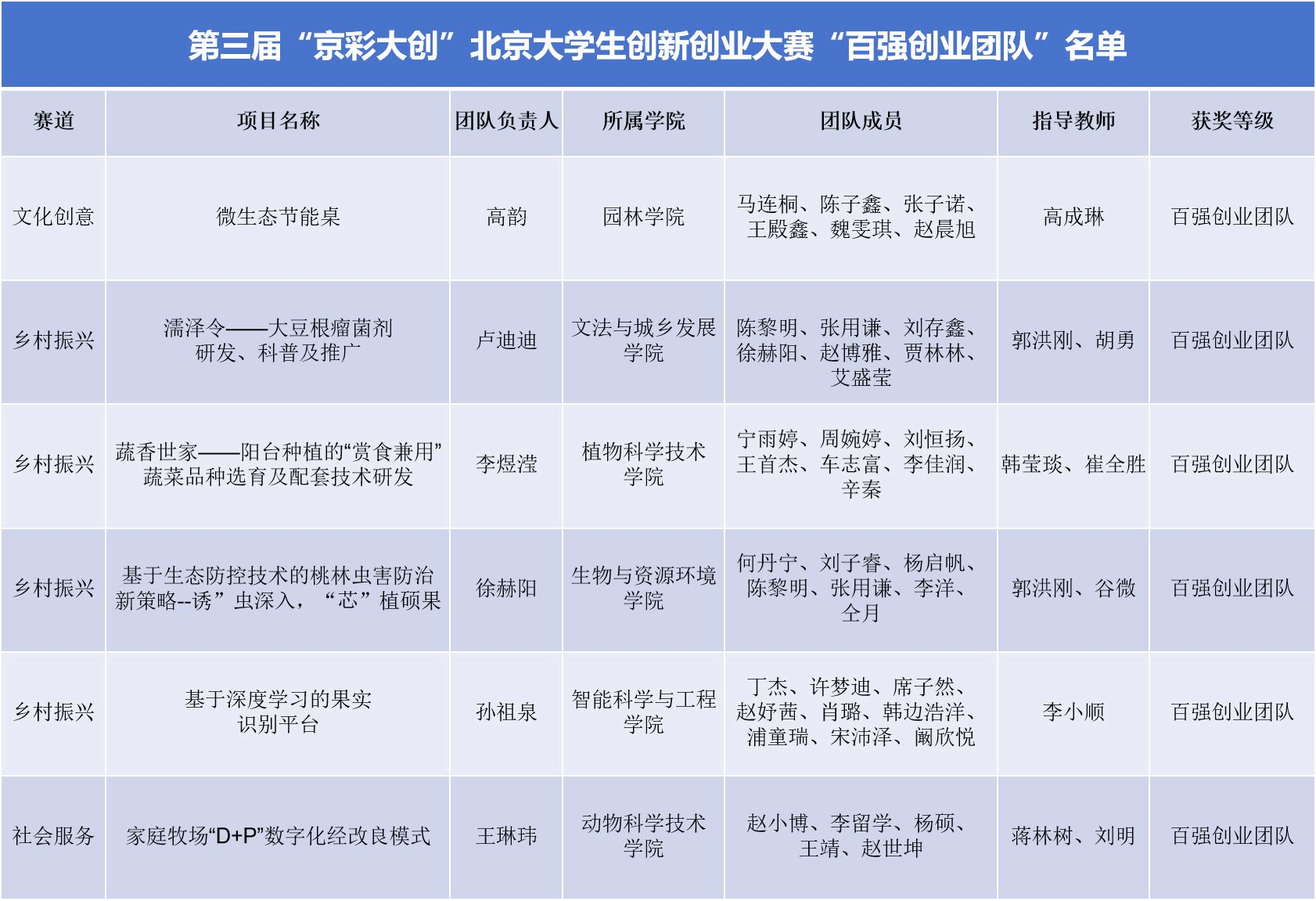 近日,第三届“京彩大创”北京大学生创新创业大赛落下帷幕。世界杯官网6支学生双创团队经过多轮线上评审和路演答辩,在6900支团队中脱颖而出,荣获北京市“百强创业团队”称号,其中2支团队首次晋级北京大学生创新创业分赛道现场决赛并获三等奖,被列为北京大学生创新创业“百粒‘金种子’项目”,获得参加中国国际大学生创新大赛(北京赛区)复赛资格。