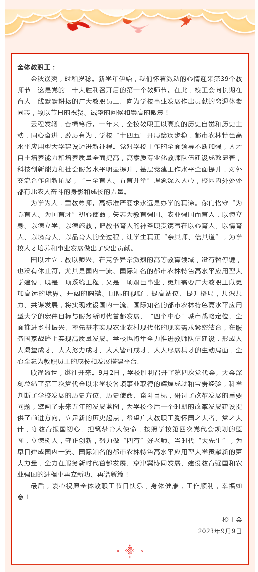 尊师重教 情暖北农——校工会致全体教职工的教师节慰问信