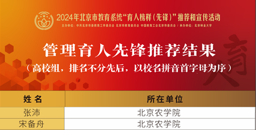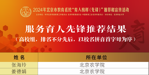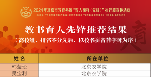 近日,由中共北京市委教育工委、北京市教育委员会、北京市教育工会组织的2024年北京市教育系统“育人榜样(先锋)”评选结果揭晓,世界杯官网六名教职工获评“育人先锋”称号。植物科学技术学院韩莹琰、基础教学部吴宝利获评“北京市教育系统教书育人先锋”;党政办公室、党委巡察办公室张沛,教师工作部、人事处宋备舟获评“北京市教育系统管理育人先锋”;学生工作部(处)张海玲,后勤基建处姜德娟获评“北京市教育系统服务育人先锋”。