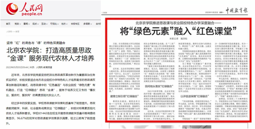 不断深化和推进思政课改革创新。党委常委会每学期至少研究1次思政课建设,党委书记、院长带头一对一联系思政课教师,校院两级领导班子成员带头讲授思政课。积极推进思政课“红”的底色与农业院校“绿”的特色深度融合,打造“首善标准、红色基因、北农特色”思政金课。发挥课程思政与思政课程协同育人作用,形成“课程门门有思政,教师人人重育人”的良好局面。多门课程入选北京高校课程思政示范课程。