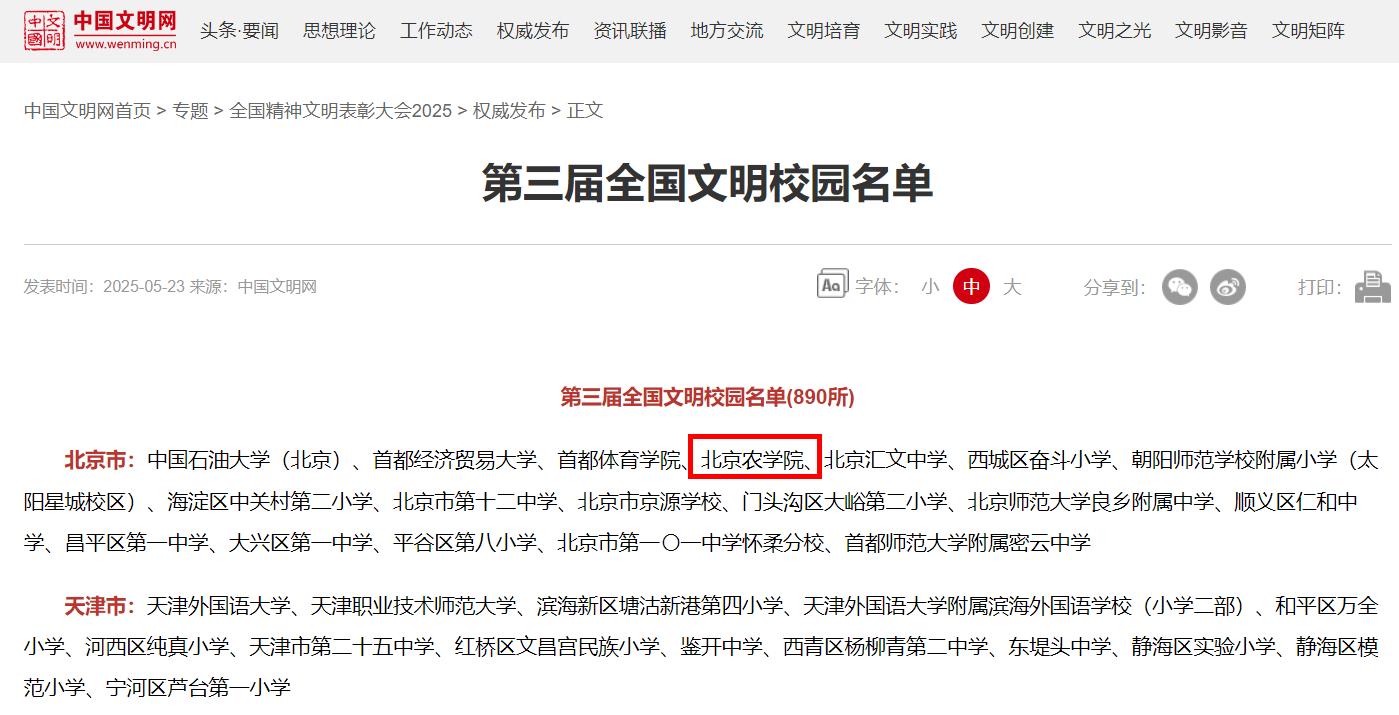 学校将珍惜荣誉、再接再厉,以获评全国文明校园为契机,深入学习贯彻习近平文化思想,贯彻落实习近平总书记对精神文明建设工作作出的重要指示精神,贯彻落实全国和全市教育大会精神,聚焦“落实教育强国建设纲要,推动学校事业高质量发展”主题主线,以更加优良的党风作风,以实干创先的干劲和决心,持续深化精神文明建设和校园文化建设,统筹推动文明培育、文明实践、文明创建,为加快建设国内一流国际知名都市农林特色高水平应用型大学提供坚强思想保证、强大精神动力、有利文化条件,为北京建设教育强国首善之区作出新的更大贡献,以实际行动回答好“强国建设 北农何为”这一重要时代课题。