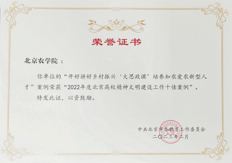 在服务乡村振兴的生动实践中开好上好“大思政课”。构建党委统一领导、相关职能部门协同联动的工作格局。近三年共组织1300余支团队、8000余名师生奔赴22个省市“三农”一线开展支农扶农,入选首都高校师生服务“乡村振兴”行动团队数量、获奖数量均居首都高校之首。形成极具农林特色的“大思政课”实践育人品牌。相关案例获评“北京高校精神文明建设十佳案例”“首都教育系统精神文明建设工作优秀案例”。