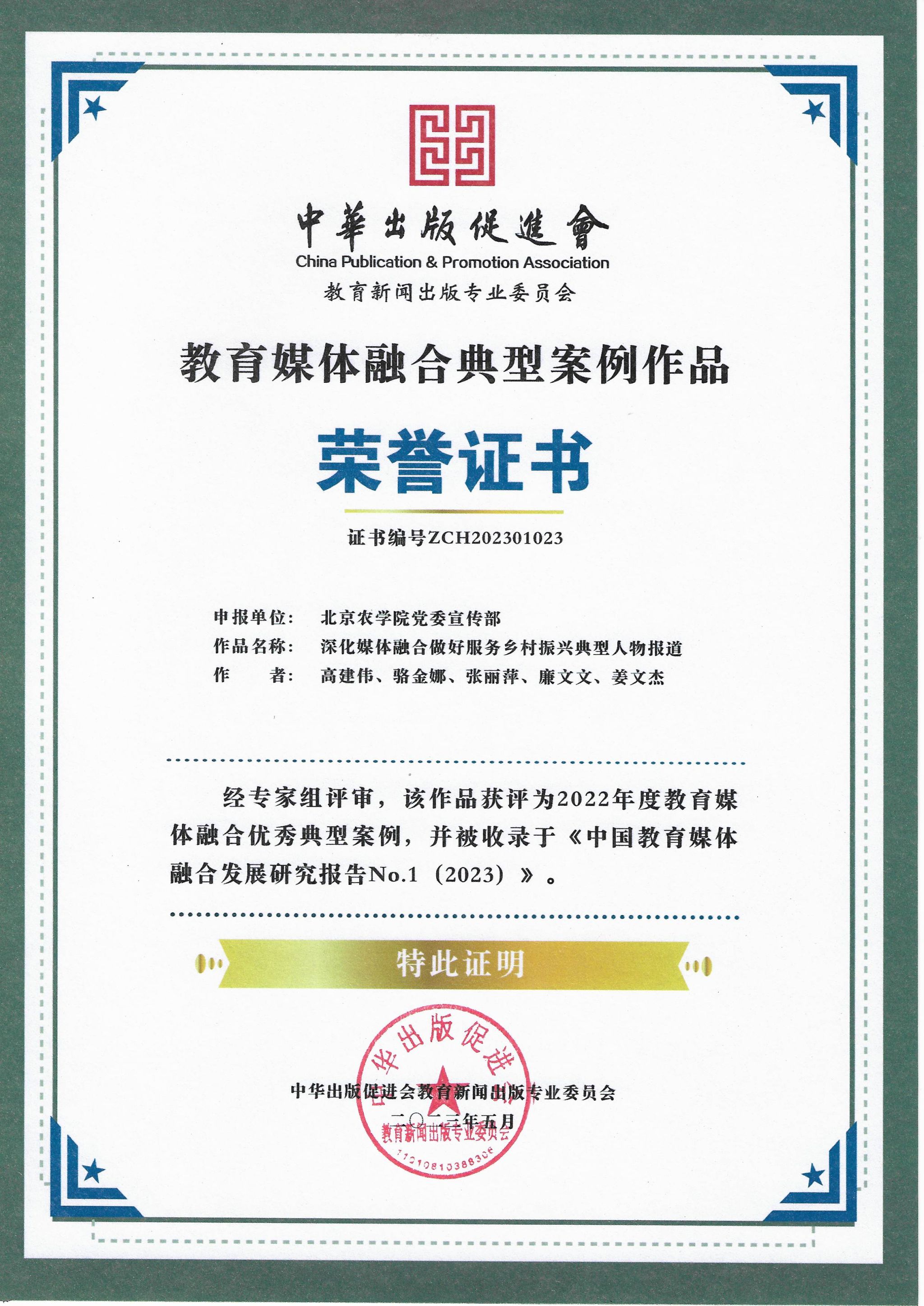 近日,由中华出版促进会教育新闻出版专业委员会主办的2023全国高校媒体融合发展高峰论坛暨媒体融合优秀案例发布会在京举行。来自全国近百所高校宣传部门负责人及获奖代表参会。会上对在高校教育媒体融合典型案例作品、案例项目、技术创新与应用场景征集活动中获奖的单位给予表彰并颁发荣誉证书。世界杯官网党委宣传部申报的《深化媒体融合做好服务乡村振兴典型人物报道》案例作品,从全国高校126件申报作品中脱颖而出,被评为2022年度教育媒体融合优秀典型案例,并被收录于《中国教育媒体融合发展研究报告NO.1(2023)》。