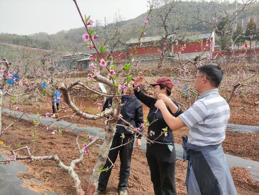 植物科学技术学院曹庆芹教授来到平谷大华山镇挂甲峪村,指导桃农配置农药对桃树进行病虫害管理。“桃树花期要对蚜虫、梨小食心虫、蓟马等害虫提前进行预防,通过喷施农药、悬挂迷向丝等降低害虫对桃树的侵害。”曹庆芹一边指导果农,一边向学生讲授疏花的意义和方法。“合理的疏花可以避免养分的无效消耗,减少幼果自疏与无效花比例,从而提高坐果率,是达到连年稳产、提高产量的必要措施。”