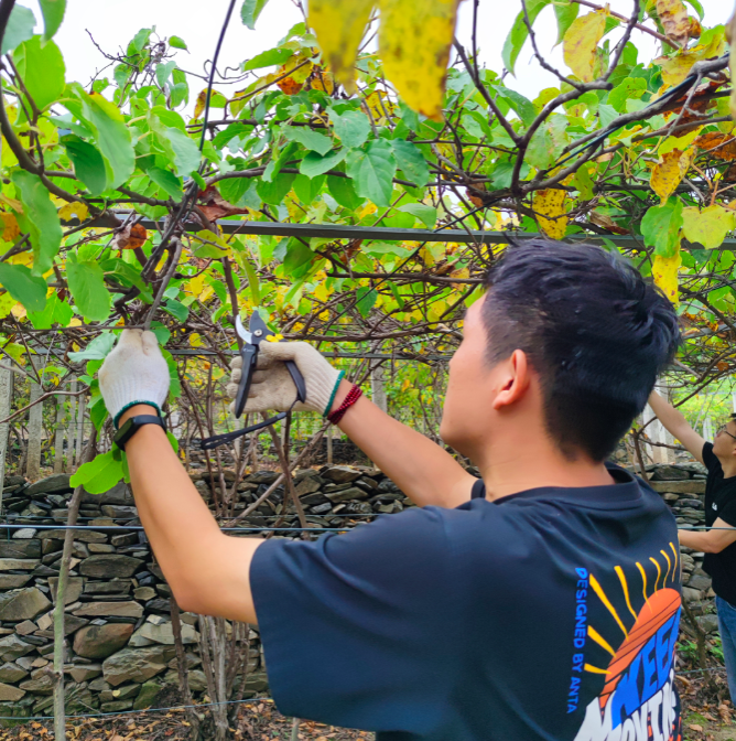 假日里,刚刚采摘完的软枣猕猴桃果树里,秋季修剪和棚架改造等工作正在有条不紊地进行着,科技小院师生坚守果园,为来年丰产打好基础。4日一早,农学院研二学生崔武琦顾不上睡懒觉,起床简单洗漱后,就带上修枝剪、绑枝机等工具,赶往村口的一片果园——种植户李叔来求助,自家的果树枝条乱长乱绕,秋剪不知从何下手。