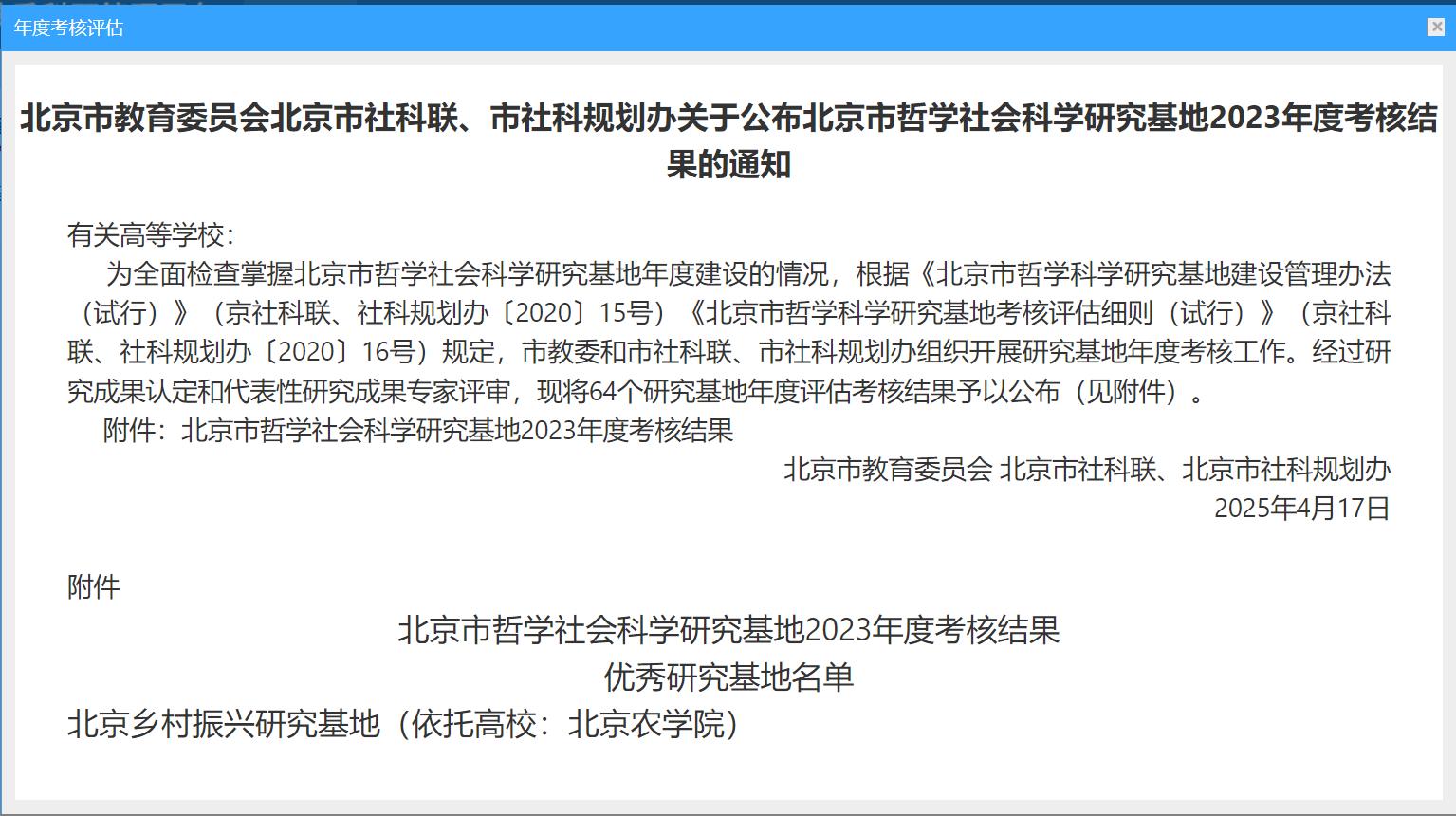 近日,市教委、市社科联、市社科规划办公布了北京市哲学社会科学研究基地2023年度考核结果,经过研究成果认定和代表性研究成果专家评审,世界杯官网北京乡村振兴研究基地再次荣获“优秀研究基地”。这是世界杯官网研究基地连续两年获评优秀。本年度共有64个北京市哲学社会科学研究基地参加考核,其中获评优秀27个。