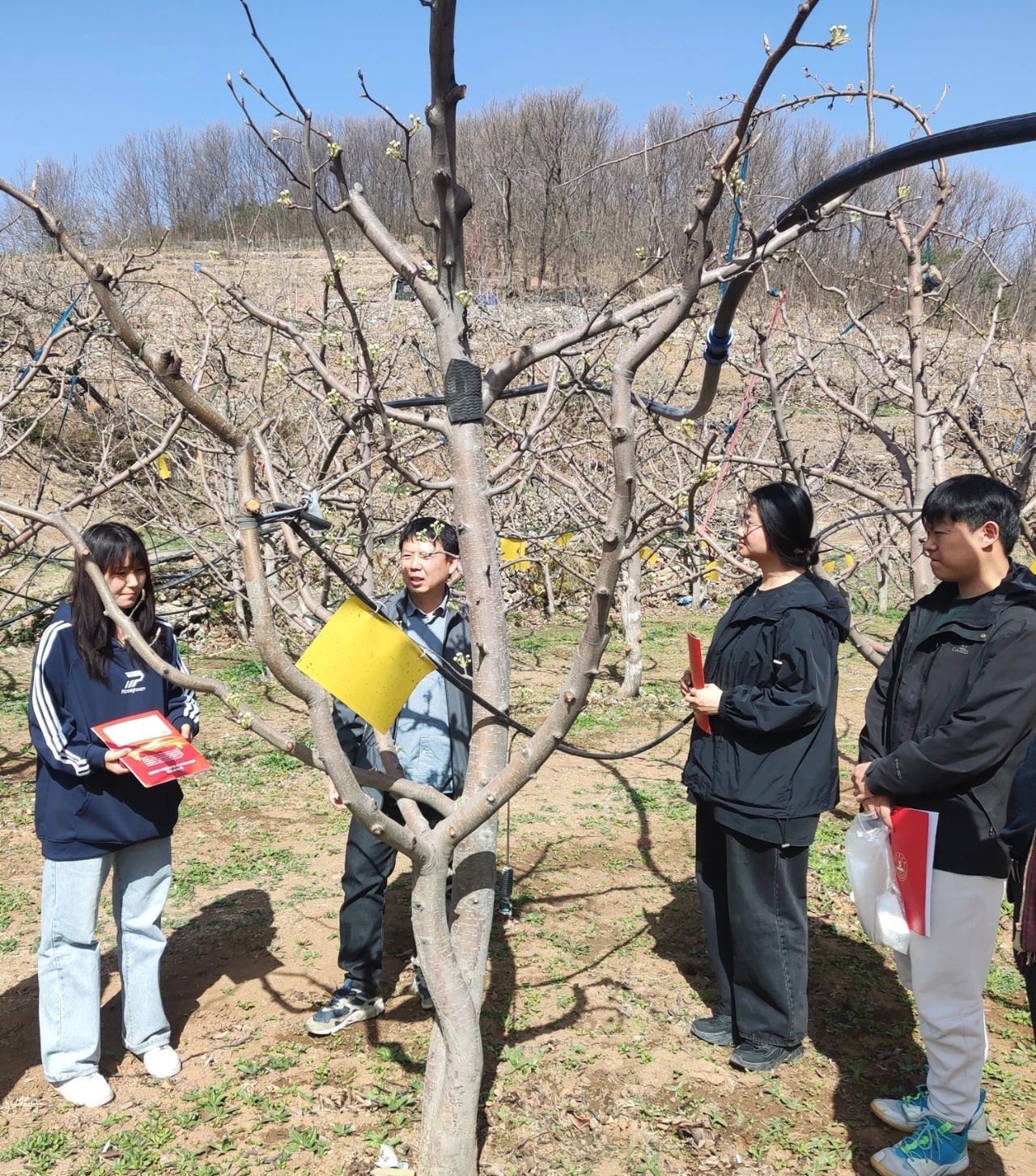 清明前后,气温骤升,正是梨木虱越冬成虫出蛰的时候,科技小院团队分别对茅山后村老果园、中果园和幼果园的梨木虱发生情况进行了调查,发现中老果园中梨木虱虫口密度迅速增加,建议果农可以在萌芽前喷洒石硫合剂防控越冬的害虫和病原,然后通过悬挂粘虫黄板防治梨木虱。