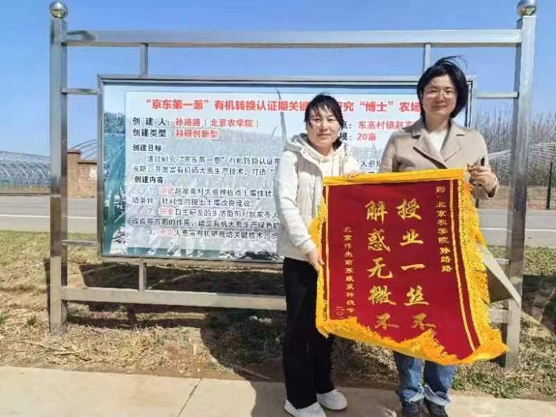 在东高村镇大葱博士农场,大家实地调研了大葱育苗情况和基地早春蔬菜生产情况。老师们对早春大葱苗和目前基地种植的花菜、甘蓝、水果洋葱等前茬蔬菜的管理提出管理措施。大家还一起深入讨论了大葱四季供应策略的问题。该村北京伟杰雨寒蔬菜专业种植合作社社长张国伟还为孙路路送上了锦旗,“感谢孙老师过去两年对合作社各方面的帮助和支持,让我们尝到了科技兴农的甜头。”