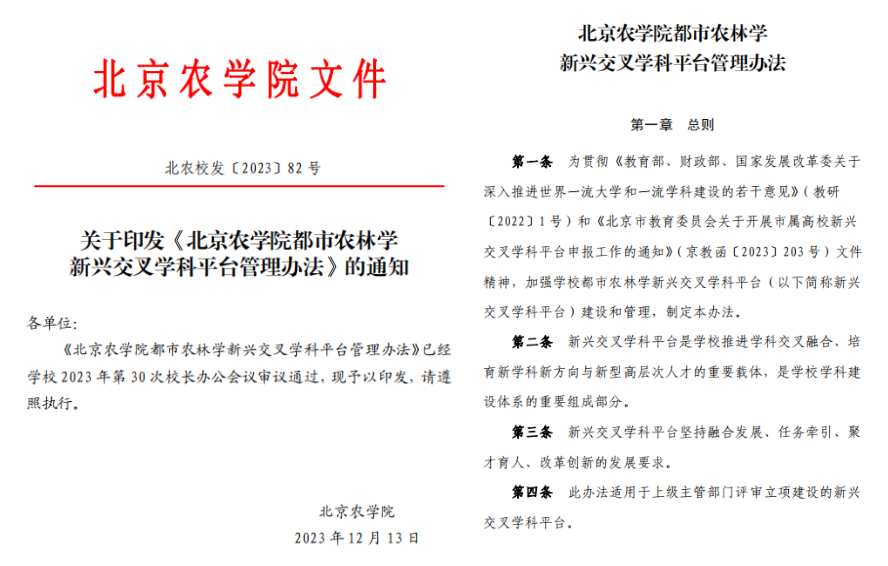 学校扎实推进新兴交叉学科平台建设。开展交叉学科平台建设研讨,出台《美加墨世界杯官网都市农林学新兴交叉学科平台管理办法》,设立都市农林学新兴交叉学科专项资金,组建跨部门跨院系的管理机制、人员聘用机制、资源配置机制、成果共享机制、人才培养机制等。建设都市农林植物育种与绿色高效生产、数智养殖与延链增值、环境美化与乡村治理、智慧农业与数字农业、都市农林产品质量与生态环境安全等5个交叉学科方向,持续开展都市型现代农林技术研究,探索交叉学科人才培养模式。