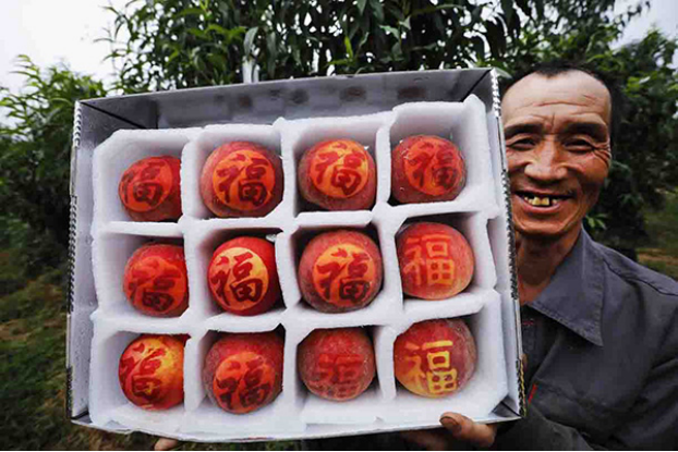 果农展示“长”有福字的文创桃