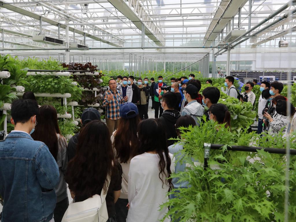 在国家级教学示范中心的玻璃连栋温室内,无土栽培的种植模式吸引了同学们的目光,同学们在刘超杰副教授的讲解下,了解现代化农业种植智能环境控制系统,以及该校教学科研团队研发的栽培基质、营养液配方、栽培新技术等。“蔬菜生长所需营养液来源于有机肥料,病虫害采用生物防治产品,可达无公害,有机绿色标准。”刘超杰介绍道。同学们一边听着讲解,一边参观温室内种植的生菜、番茄、黄瓜等蔬菜,观赏矮化番茄、矮化辣椒、安其拉花茄、金桔、枇杷、矮化苹果等盆栽园艺植物,直呼大开眼界。