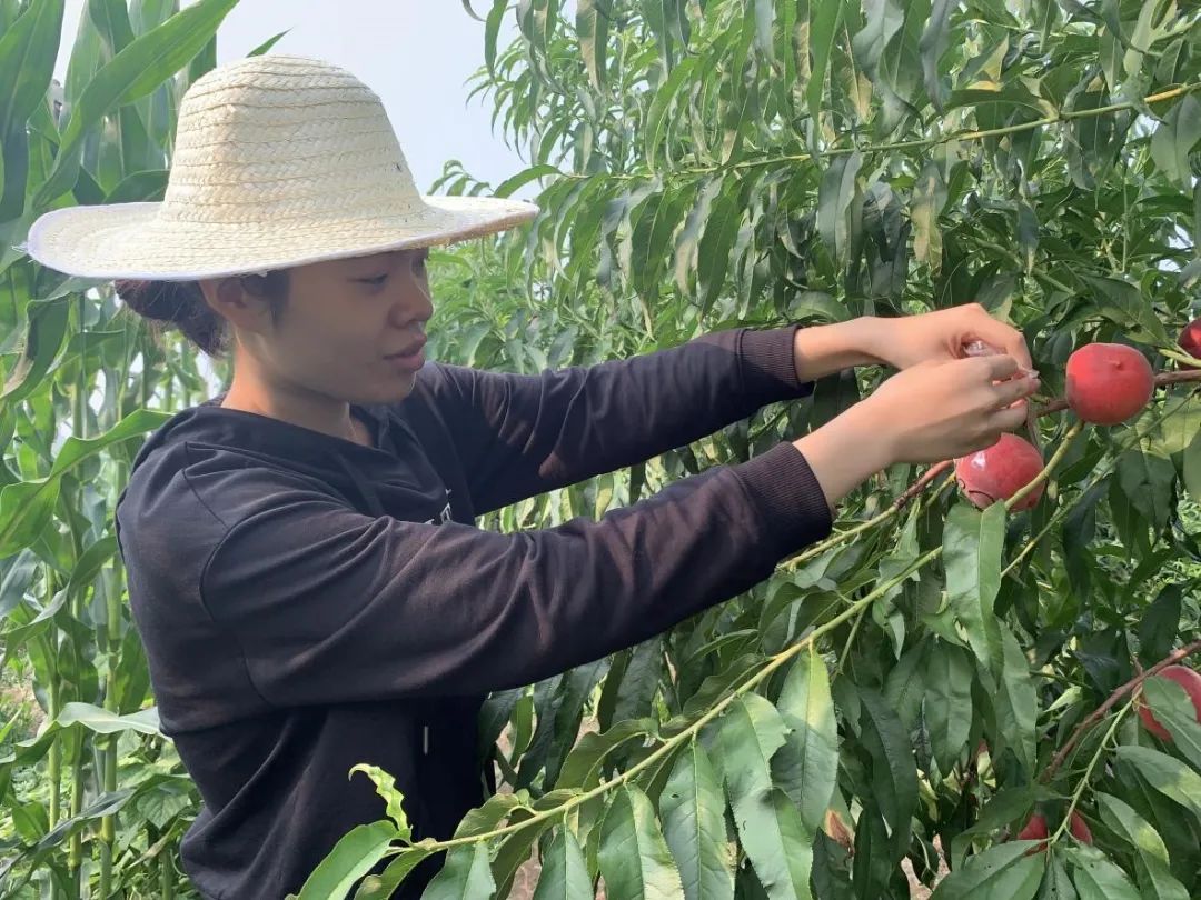 师生走进田间地头,从桃贴的设计、制作、裁剪,再到田间寻找合适的果型、贴制以及历经一周晒印图案成形的文创桃总结,切身体会文创桃制作的全过程,将文创桃的制作过程对果农进行指导。