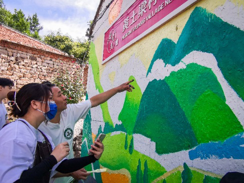 以黄土梁村委会墙为“画板”,北农师生共绘一幅画,将艺术作品立体运用于乡村公共空间,以自然美丽、特色鲜明的艺术形式弘扬社会主义核心价值观和新时代乡风民风。墙绘作品以乡村振兴为主题,描绘黄土梁村美好景色,传递出“绿水青山就是金山银山”的理念。“这项活动既紧扣高校服务乡村振兴的活动主旨,又展现了园林学院艺术设计专业的特色,同学们热情高涨,劲头十足。”带队老师王亚英说。