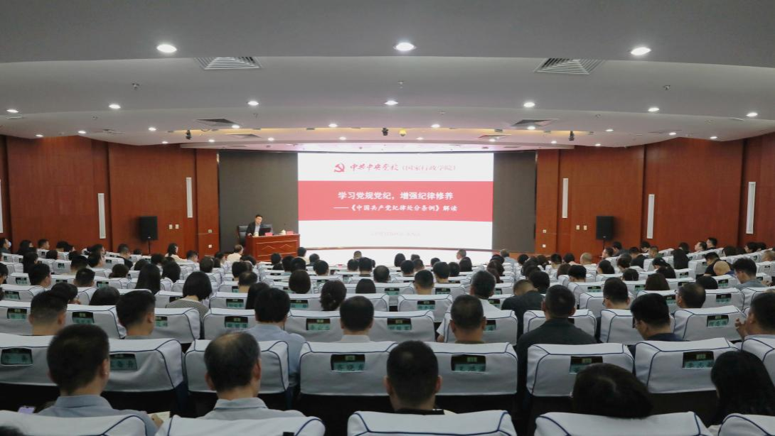 为进一步深入学习贯彻习近平总书记关于党纪学习教育的重要讲话和重要指示精神,深入学习新修订的《中国共产党纪律处分条例》(以下简称《条例》),扎实开展党纪学习教育,5月10日下午,学校举办党纪学习教育专题辅导报告会。全体校领导、中层干部、党支部书记、部分科级干部、学校第二期青干班学员及师生党员代表等共计300余人参加,党委副书记仲丛生主持会议。