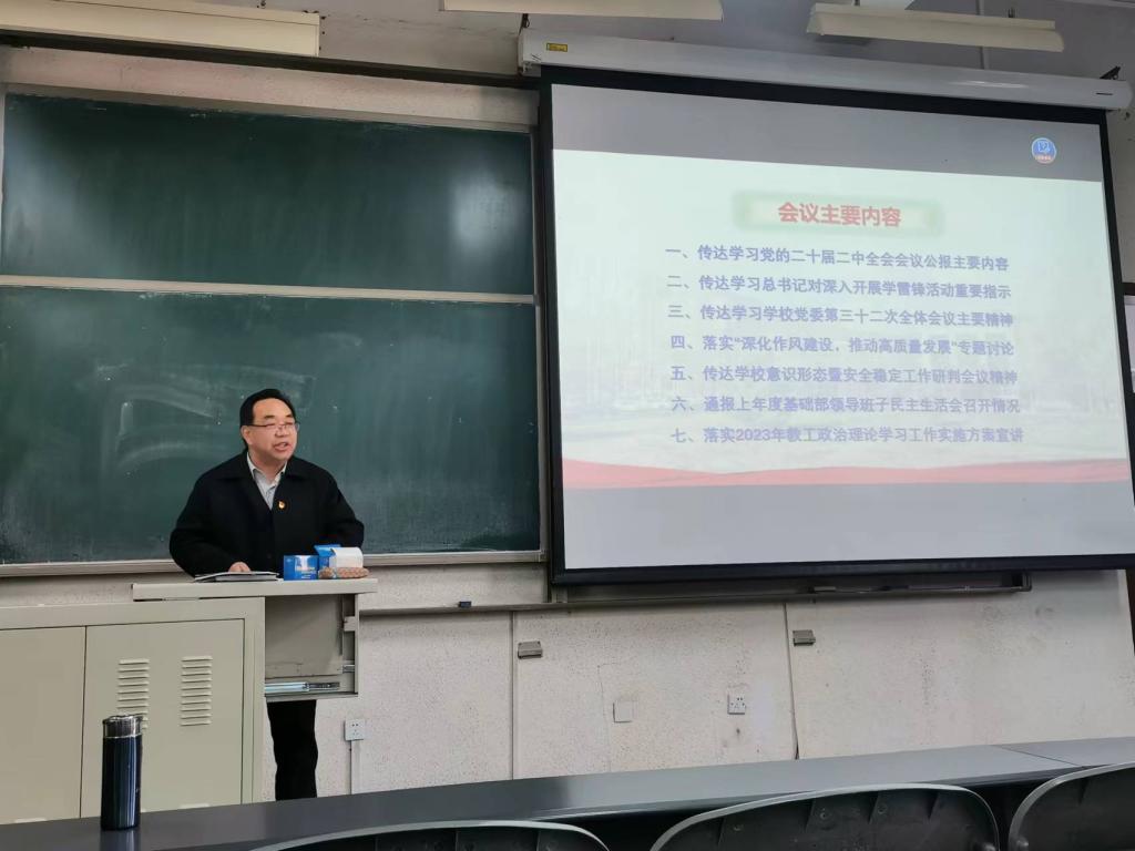 会上,马修地传达学习了党的二十届二中全会会议公报主要内容、习近平总书记对深入开展学雷锋活动的重要指示、学校党委第三十二次全体会议主要精神。马修地组织落实了“深化作风建设,推动高质量发展”专题讨论,传达了学校意识形态暨安全稳定工作研判会议精神,通报了上年度基础部领导班子民主生活会召开情况,就“基础部2023年教工政治理论学习工作实施方案”做了宣讲和解读。