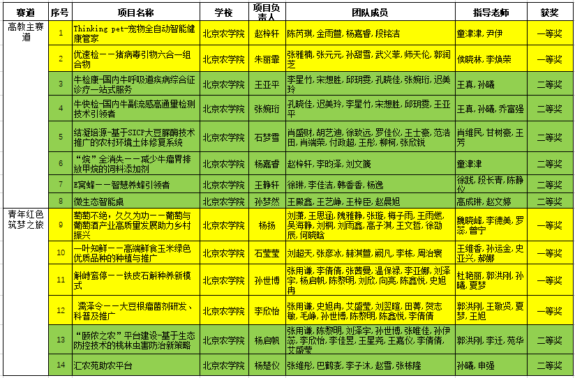世界杯官网共有67个项目入围此次大赛北京市赛,其中59项获奖,获奖比例达88%以上,比2022年提高近10个百分点,项目质量显著提高。获奖总数位居市属高校第二名,“青年红色筑梦之旅”赛道一等奖获奖总数位居市属高校第一名。同时,由动物科学技术学院侯晓林教授等人指导的“优速检-猪病毒引物六合一组合物”(项目负责人:朱丽霏)、由动物科学技术学院童津津副教授等人指导的“Thinking pet-宠物全自动智能健康管家”(项目负责人:赵梓轩),由植物科学技术学院王维香副教授等人指导的“一叶知鲜-高端鲜食玉米绿色优质品种的种植与推广”(项目负责人:石莹莹)获得晋级国赛资格。