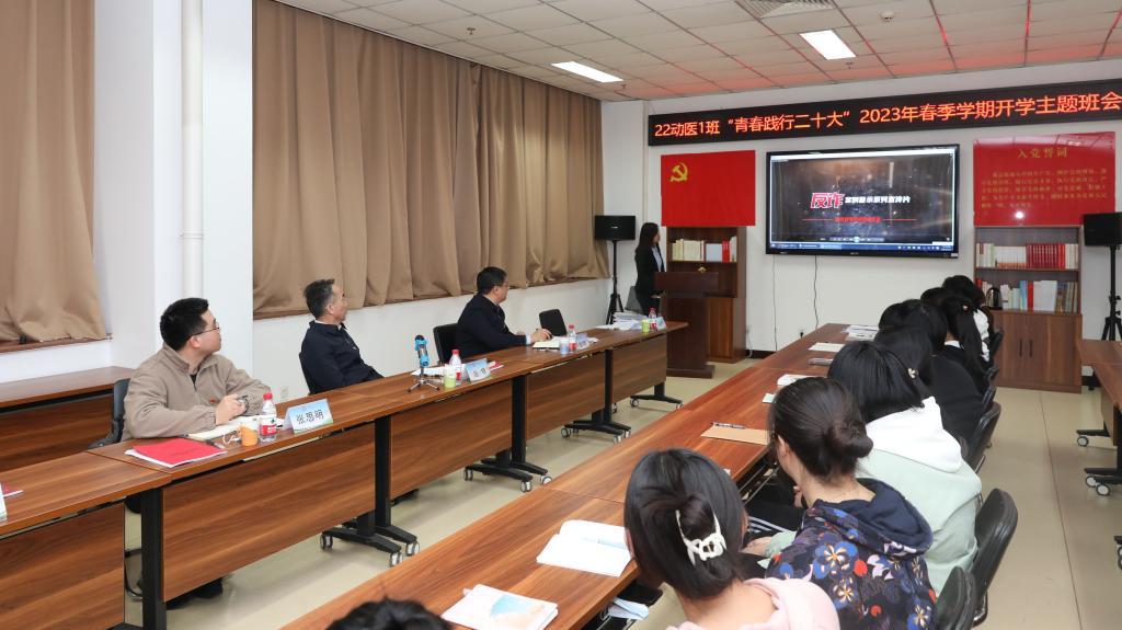 2月23日下午,学校党委书记赵锋走进动物科学技术学院2022级动医1班,和同学们一起开展“青春践行二十大”新学期主题班会,为同学们上新学期“第一课”。