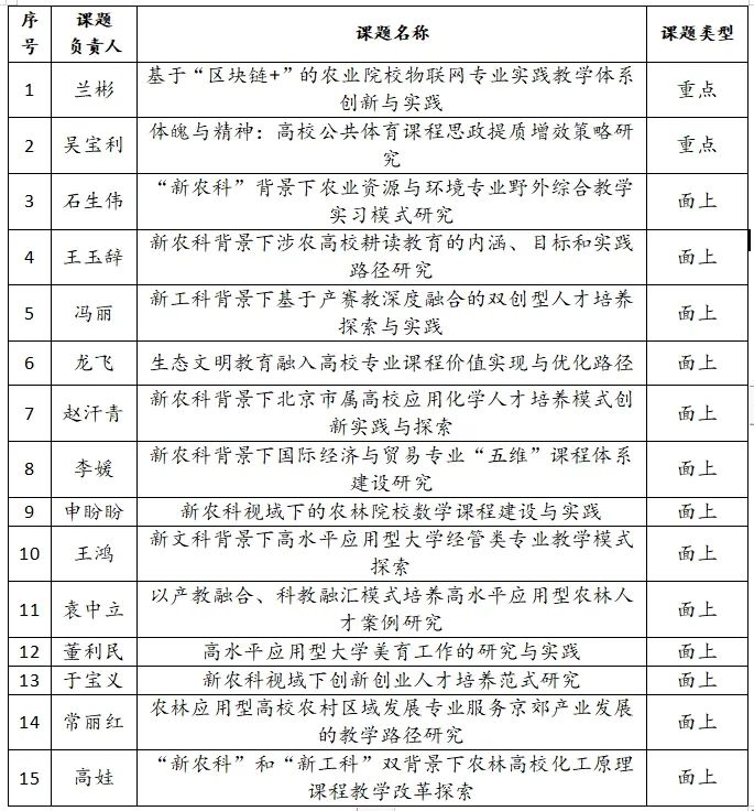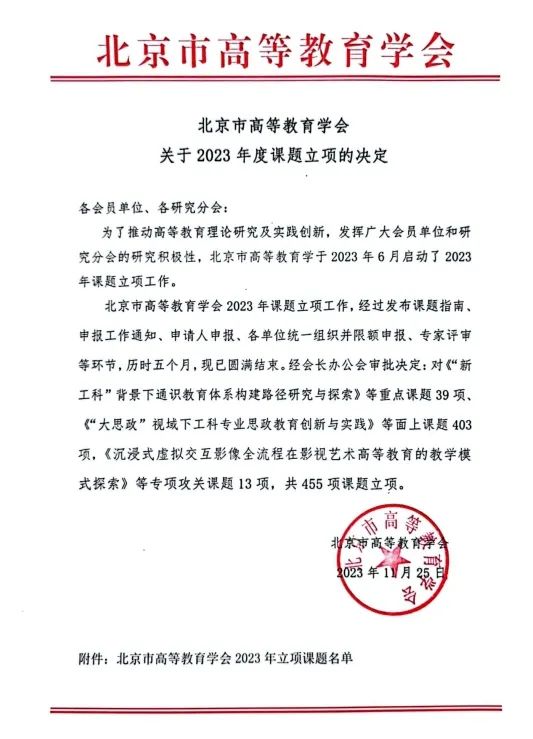 根据《北京市高等教育学会关于2023年度课题立项的决定》,世界杯官网共获批15项课题立项,其中重点课题2项、面上课题13项,具体信息如下: