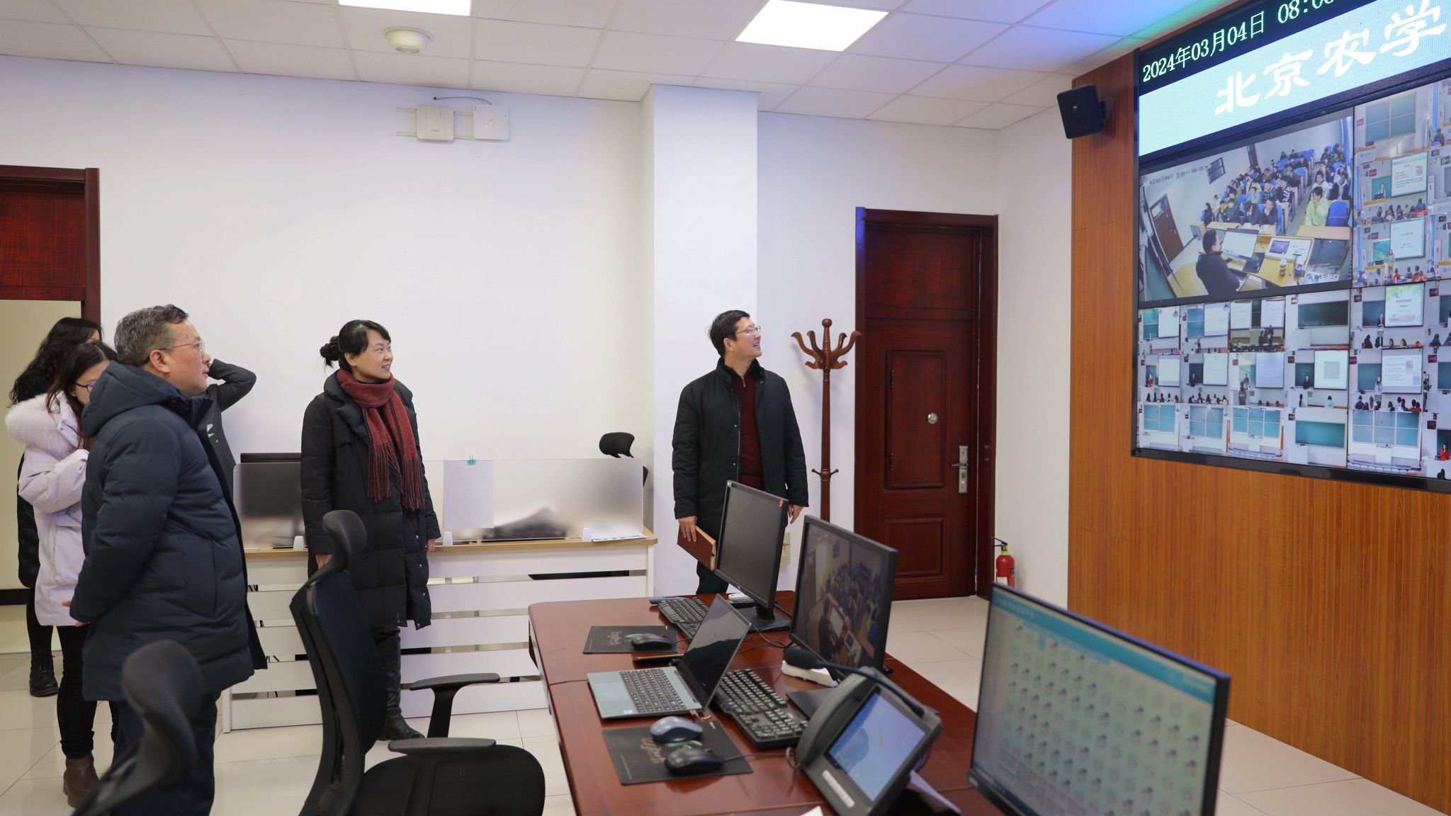 校领导一行先后检查了教学楼A座、B座各层教室上课情况。在学校多媒体教学控制中心,检查组随机调取了4门课堂进行远程听课,检查任课教师上课到位情况、教学效果以及学生课堂出勤、听课和课堂秩序情况,查看了VR虚拟实训智慧教室设备及功能。