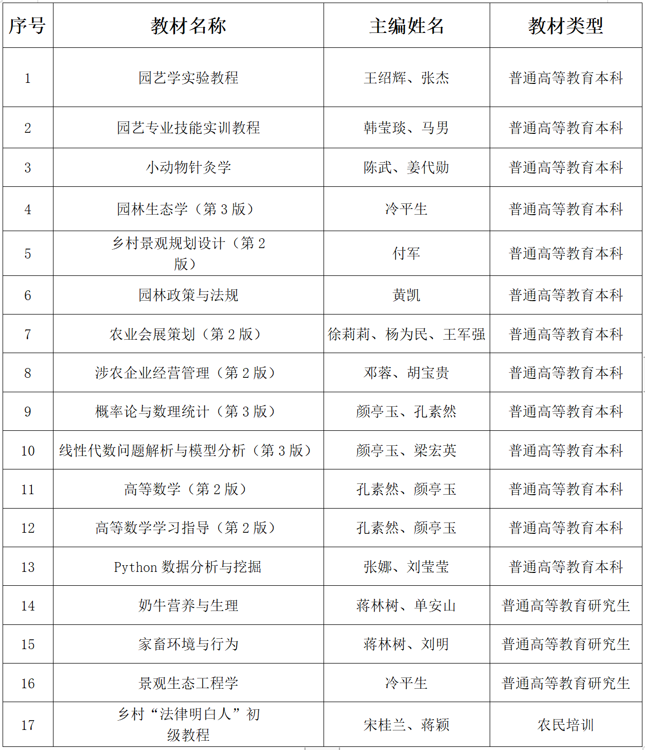 近日,农业农村部教材办公室发布《关于公布首批农业农村部“十四五”规划教材名单的通知》,世界杯官网共17部教材入选,其中13部普通高等教育本科教材,3部普通高等教育研究生教材,1部农民培训教材。