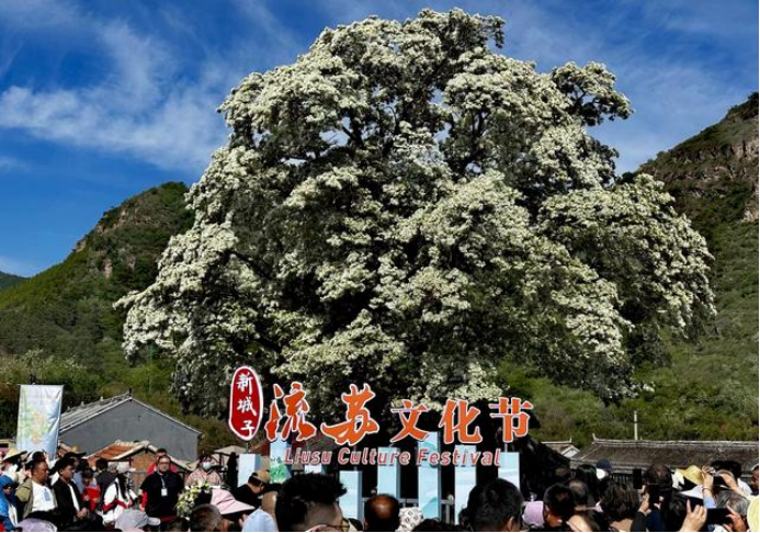 苏家峪村拥有北京最古老的一株一级古流苏树。这是一株有着580年树龄的古树,树高约13米,主干1.3米处分为两主枝,两条树枝从主干向上伸展,成伞状树冠,冠幅约16米,盛花期在5月10日前后,花期仅有10天左右。2023年5月,学校乡村旅游团队参与策划了“赏百年流苏,游古堡新城”首届流苏文化节,吸引众多游客前来观赏。